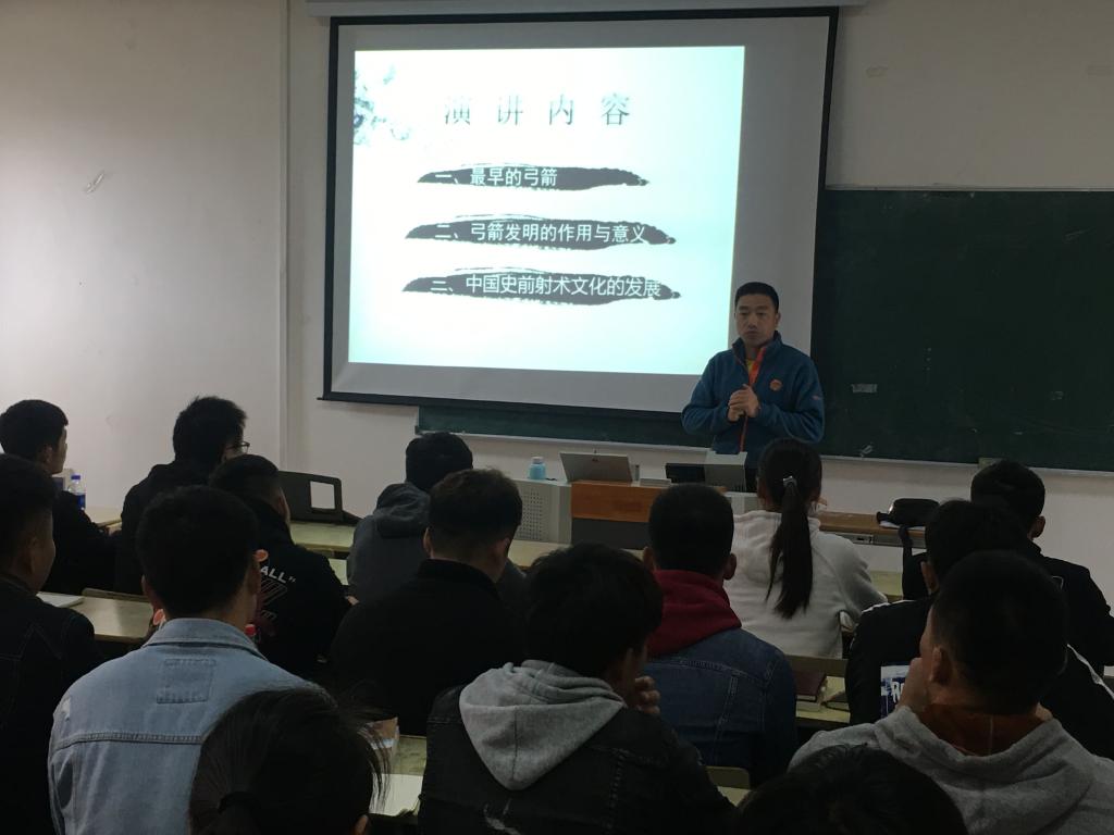陈光华副教授在龙山校区体育馆多媒体教室为该院2016级、2017级休闲体育专业学生作题为“史前射术文化”的学术报告。