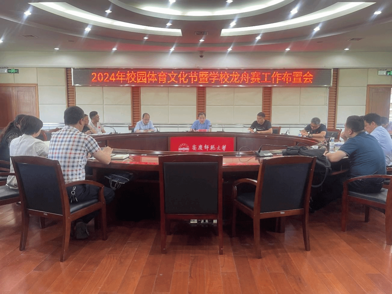 参会人员交流协商,并就校园体育文化节与龙舟赛筹备的建议与注意事项进行了研讨。