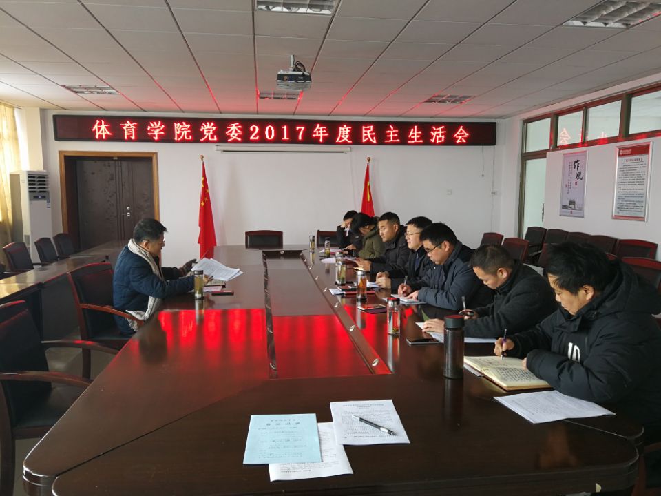 2018年1月29日上午,学院党委班子2017年度民主生活会在体育馆三楼会议室召开,学院领导班子及全体党委委员参加会议。校纪委副书记、机关党委书记、监察审计处处长王先民到会指导,会议由学院党委书记戴卫义主持。