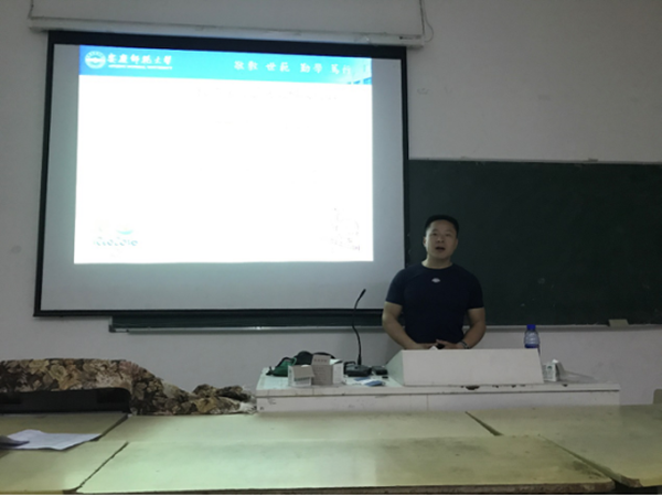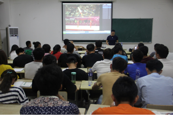 吴海鸥副教授在体育馆多媒体教室做学术讲座,主题为“新周期国际竞技体操男子规则和裁判法”系列讲座之一——双杠理论与实践。2016级体育教育专业全体同学等80多人参加讲座。