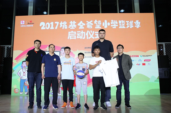 5月22日晚 ,“2017姚基金希望小学篮球季”在北京NBA姚明篮球俱乐部正式启动。姚基金创始人姚明代表主办方为2017全国集训及联赛承办城市南京市授旗并与嘉宾合影。中国青少年发展基金会理事长王剑、副秘书长杨春雷以及爱心企业代表、高校代表、支教志愿者代表、项目受助乡村小学代表等共同出席了本次活动。
