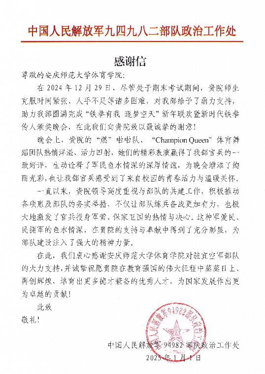 表演(体育舞蹈方向)专业两支队伍——“燃”啦啦队和“Champion Queen”体育舞蹈团队参与演出。演出获得圆满成功,为部队官兵们呈现了一场精彩绝伦的视听盛宴。
