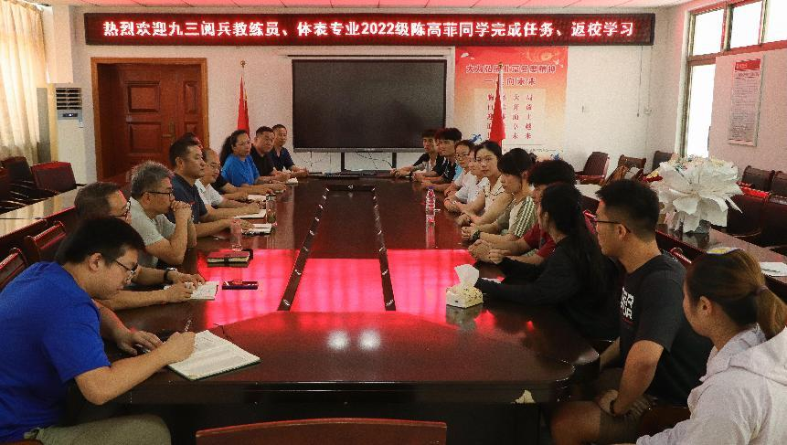 领导、教师代表和曾经当过兵的毕业班骨干学生齐聚一堂。毕业班学生代表、表演(体育艺术表演方向)专业2022级(1)班张耀辉在发言中表示:“看到身边同学获得如此荣誉,我感到无比自豪。陈高菲就是我们身边的榜样,她的经历激励着我们不断向前。”到场学生纷纷表达了对她的敬佩之情,并表示要向她看齐。