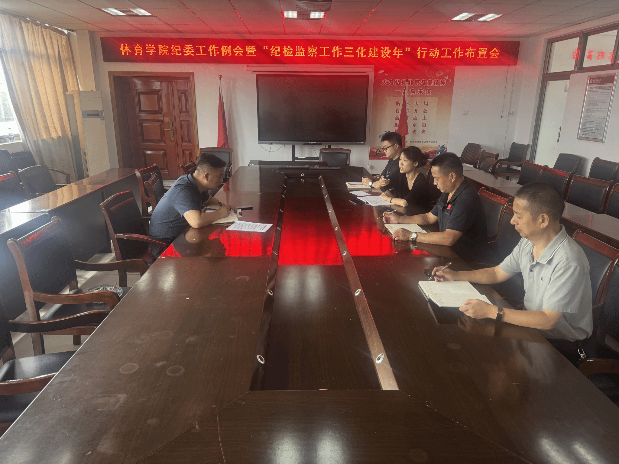 组织召开纪委工作例会暨“纪检监察工作规范化法治化正规化建设年”行动工作布置会。会议由体育学院纪委书记杜百忍主持会议,纪委委员、国有资产管理员及新生辅导员参加会议。