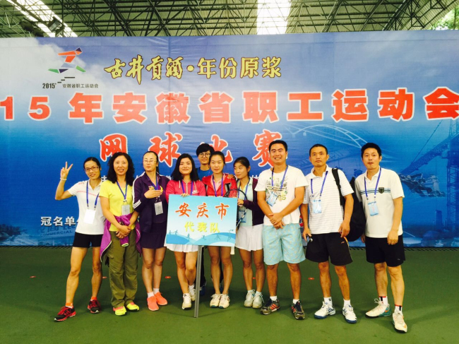 另据悉, 2015年安徽省职工运动会网球比赛也于9月22日在安徽省体育局网球中心合肥尚泽网球俱乐部落下帷幕。应安庆市总工会邀请,我院抽调教师滕飞、高茜及部分学生代表安庆市参加了此次比赛。他们用精彩的赛场表现充分展示了体院人团结一致,敢于拼搏,永不服输的精神面貌。最终经过2天的激烈角逐,由高茜、徐雯智参加的女子双打获得第五,高茜、刘猛参加的混合双打获得第七,徐雯智、王洪参加的混合双打获得第八。