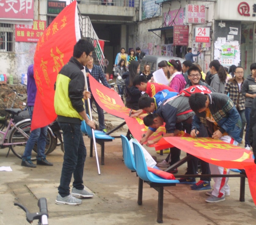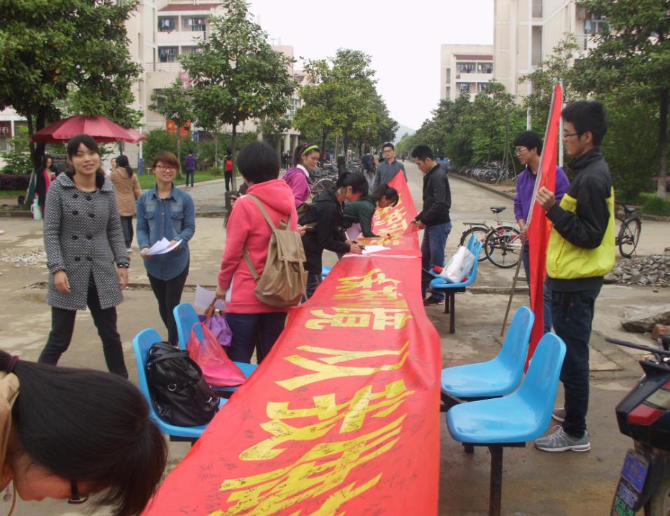 为进一步推动校园和周边环境的建设,美化我们身边的环境,培养大家的环保意识,以及响应省委,省政府就以“三线三边”为突破口开展的综合整治。4月17日,来自我院2011级的19名学生走进学校各个食堂,开展关于环境保护的万人签名活动。