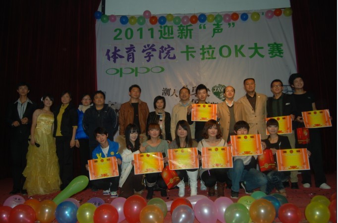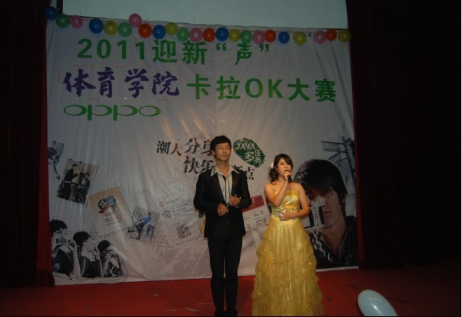 伴着动感的音乐,晚会在体育教育专业2009级健美操专选班充满激情的健美操表演中拉开了序幕。本次大赛经过前期的初赛,共有九名选手进入了今晚的决赛。决赛一共分为两轮进行,第一轮歌曲演唱环节,第二轮才艺展示环节。在绚烂缤纷的舞台上,选手们更显得光鲜耀眼,大家都尽情演绎自己的歌曲,在舞台上展现着自我的精彩。经过第一轮的比拼,有六位同学晋级了第二轮。在才艺展示的环节中,选手们都拿出了看家的本领,有的舞动出激情四射的舞蹈,有的弹奏出委婉动听的钢琴曲,还有的表演标准的英文朗诵。又一轮激烈的角逐之后,最终体育艺术表演专业2011级1班的董军以其出色的表现摘得本次卡拉ok大赛的桂冠;体育教育专业2011级6班的谭天和体育艺术表演专业2011级1班的付宇航获得二等奖;体育教育专业2011级6班余颖超、昂雅,体育艺术表演专业2011级2班的李冬获得三等奖。整个比赛中,掌声与欢呼声此起彼伏。在比赛过程中,还穿插了舞蹈、话剧等精彩的表演类节目,尤其是一曲由上届获奖选手和本届获奖选手共同演唱的《恋爱ing》,更是将晚会推向了高潮。大赛最后,伴随着动听的音乐,学院领导和评委老师为获奖选手颁奖并合影留恋。