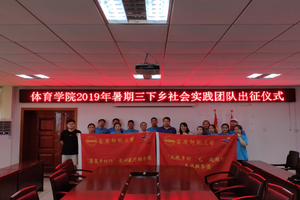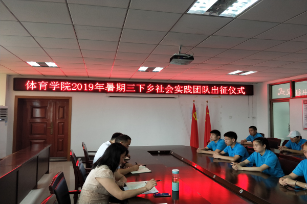 2019年暑假“三下乡”社会实践团队出征仪式在会议室举行。副院长林秋菊、党委副书记高栋梁、院团委副书记陈守朋、专职辅导员储著奇以及社会实践团队成员参加仪式。