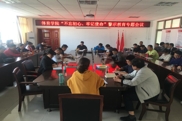 在体育馆会议室召开“不忘初心、牢记使命”警示教育专题会议,党委书记王开友主持会议,学院全体教职工参加了警示教育。