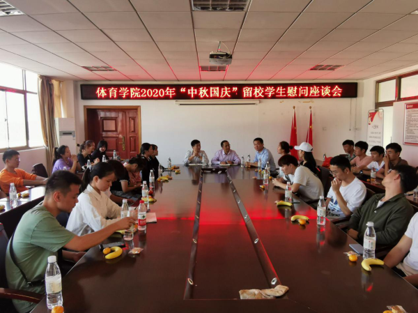 体育馆三楼会议室其乐融融,气氛热烈!学院在此召开了 2020年中秋国庆留校学生慰问座谈会。学院党委副书记高栋梁出席会议,学院大一到大四各年级留校学生共计30余人参加了会议,会议由辅导员储著奇主持。