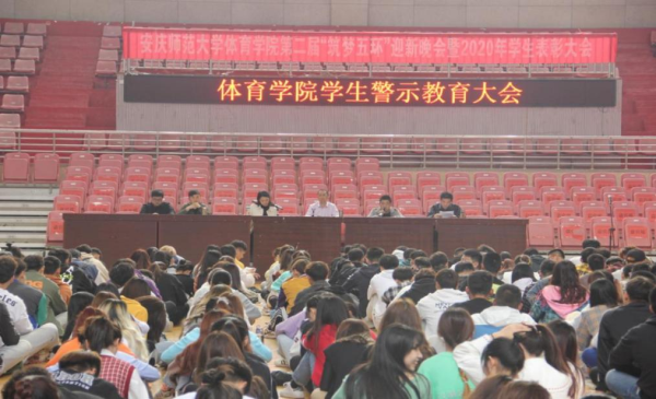 在篮球馆召开学生警示教育大会。学院领导、教学办、团委和全体专职辅导员老师出席会议,学院一至三年级全体本科生和研究生参加会议。