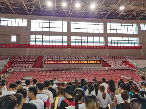 在体育馆篮球馆召开2020-2021学年第二学期期末考试考风考纪暨安全纪律教育大会。副院长林秋菊、党委副书记高栋梁、教学办、辅导员和专业教师代表出席会议,全体本科生参加会议。