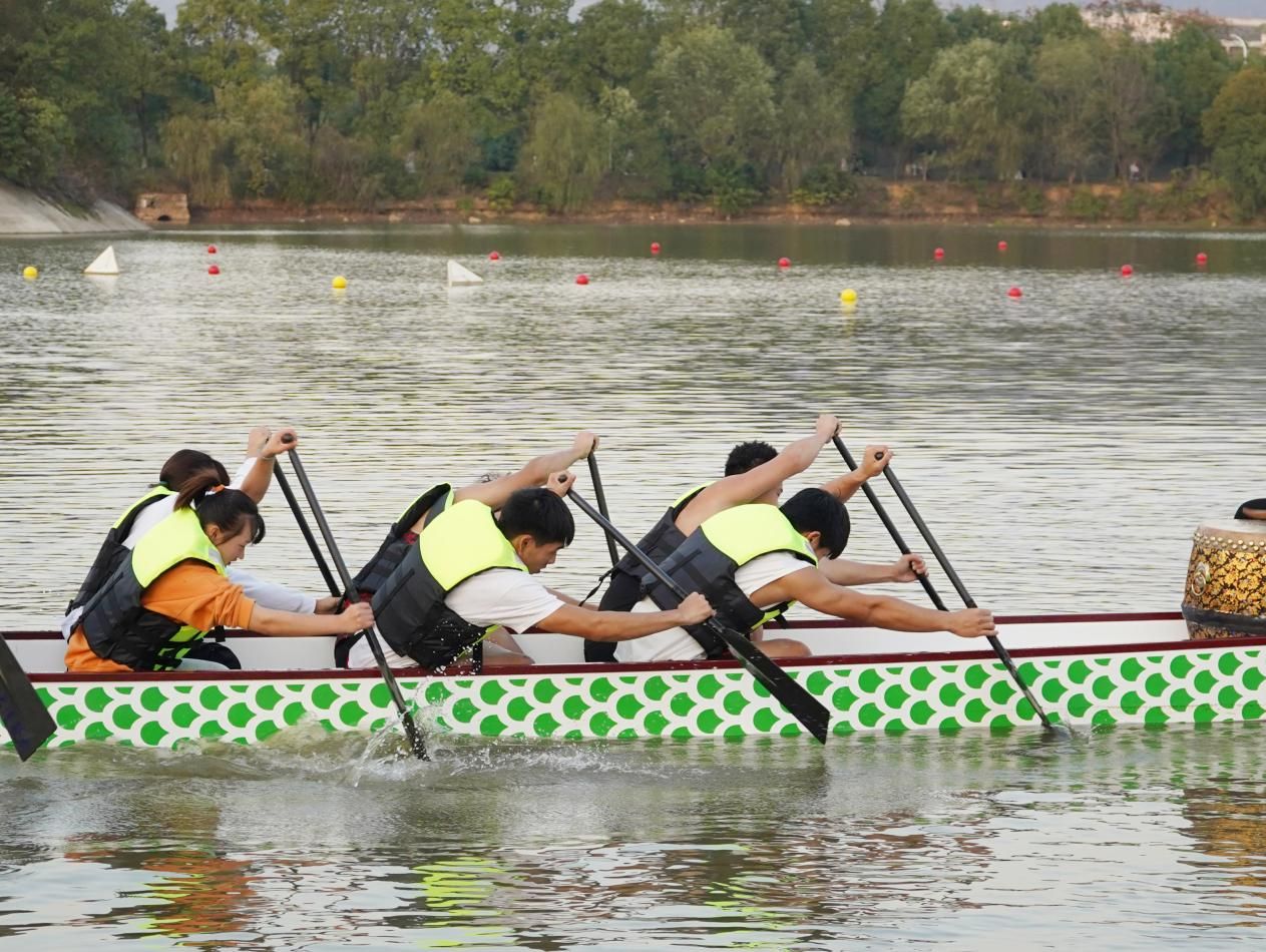发挥校园特色和传统体育优势,充分挖掘龙舟运动的传统文化元素,组建龙舟队,在一系列重大赛事中屡创佳绩,使之成为学校体育运动的一张“名片”。学校还将其纳入体育选修课程,鼓励全校师生积极选报。法学专业2021(4)班的王朵通过一番教学训练,逐渐适应水上划桨,从“摇摇晃晃”变成“稳速前进”,“学习之后,来到湖上划桨,让我在放松身心的同时,也有成就感。”