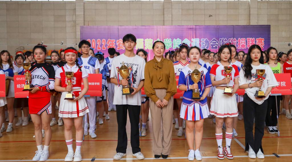 承办的2022年校综合运动会啦啦操联赛在龙山校区体育馆举行。校党委常委、校体委副主任、副校长吴琼出席颁奖仪式,并为获奖代表队颁发奖杯及证书。