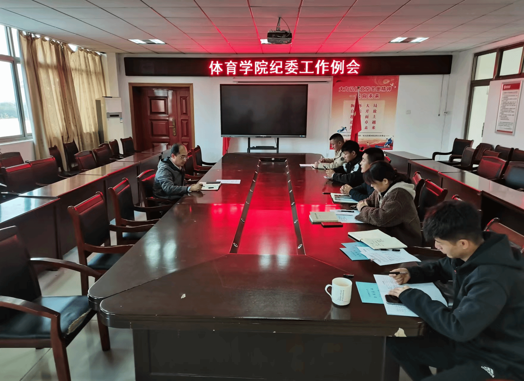 在体育馆三楼会议室召开纪委工作例会。会议由学院党委副书记、纪委书记王玮主持,学院纪委委员,教学、学工、行政、采购、资产管理等相关科室负责老师参加了会议。