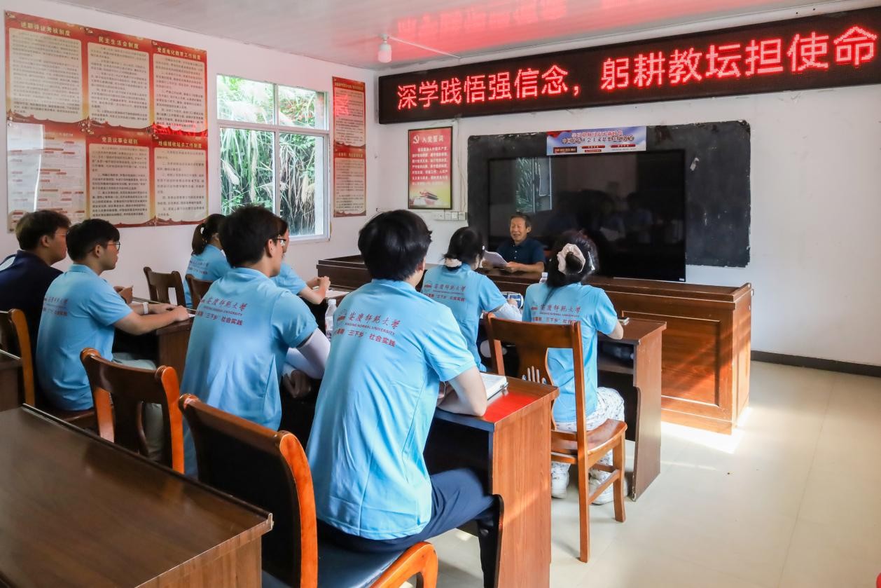 “三下乡”实践团队的青年学子们听着有36年工作经验的老教师、西冲村退休老校长朱中明讲述乡村教育里的红色传承与使命担当。