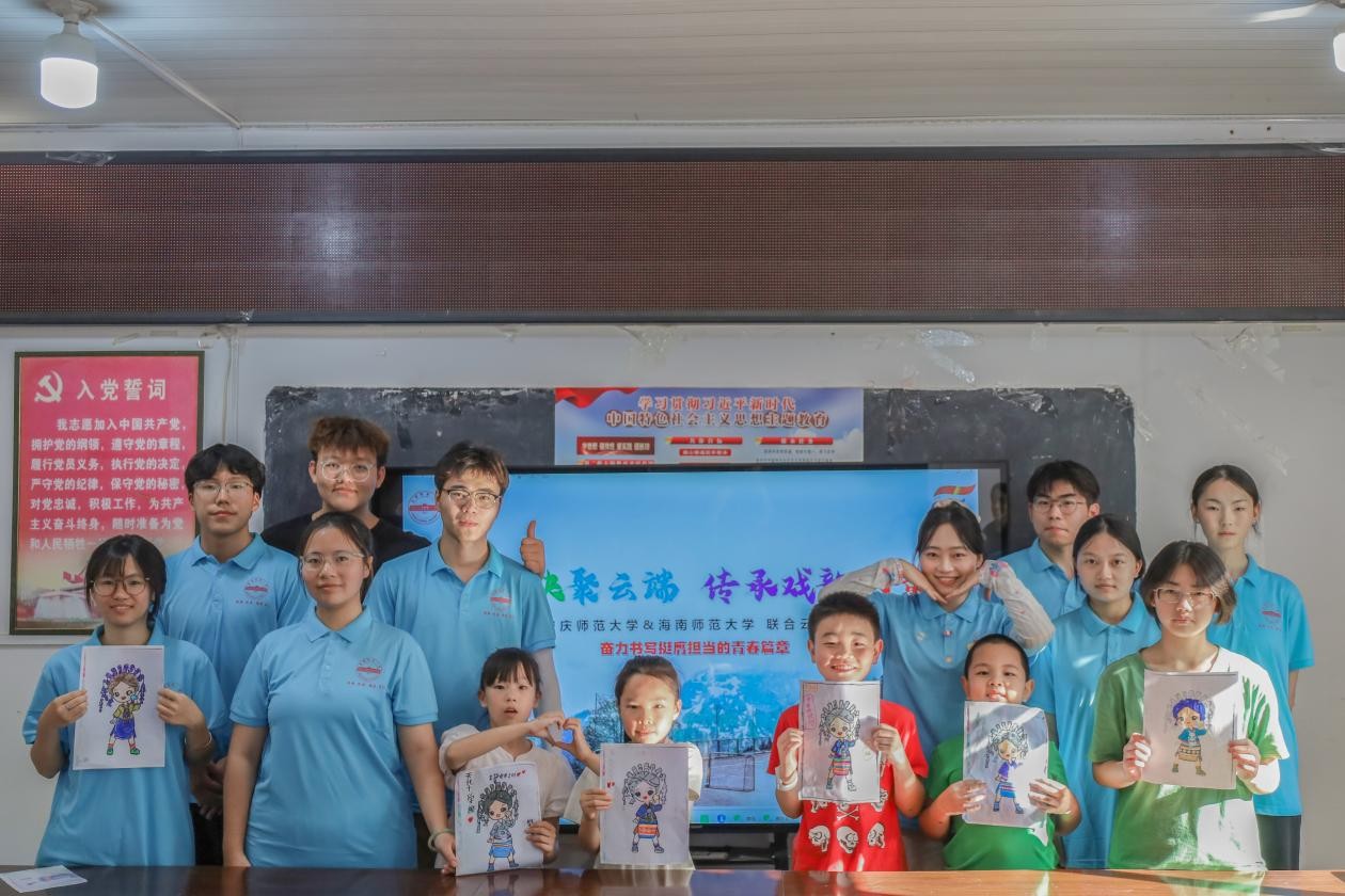 暑期“三下乡”实践团队在天华镇西冲村与海南师范大学“研传身教”教育关爱服务团开展线上联动,通过云端课堂指导西冲村小朋友为特制绘纸上的黎族小女孩形象填色,并讲解黎族服饰文化,用创意与知识搭建起跨越山海的文化桥梁。