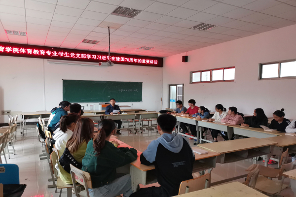 学生党支部在支部活动室组织专题学习,学习内容为习近平总书记在庆祝中华人民共和国成立70周年大会上的讲话,并就庆祝大会畅谈体会感悟,支部全体党员参加会议,学习会由支部书记程启平老师主持。