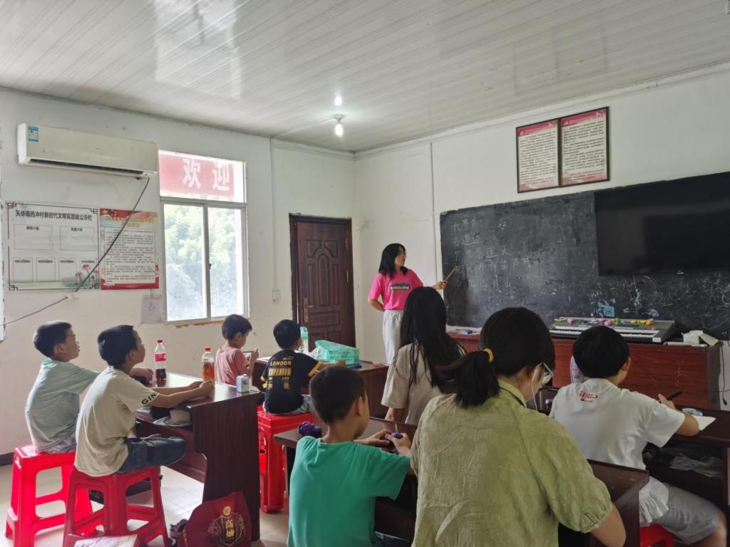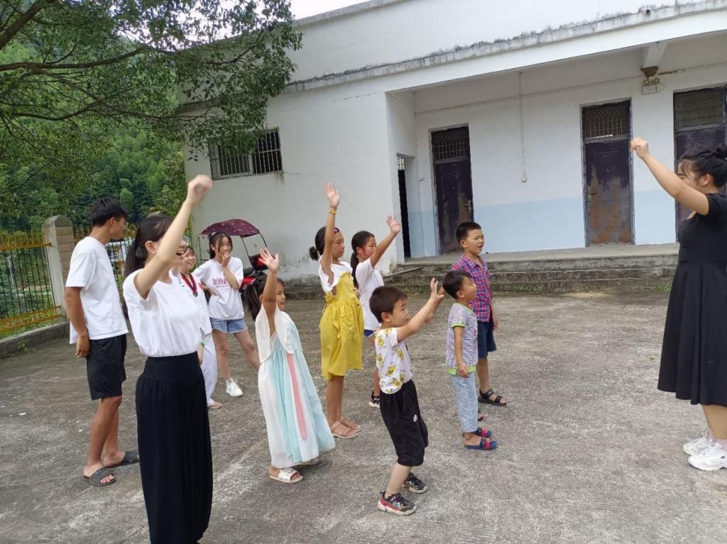 学生暑期三下乡社会实践服务队走进了安庆市太湖县天华镇西冲村。在村子里教学的这段生活中,队长刘会茹带着队员们和村子里的小朋友们一起进行了歌曲和舞蹈的学习。