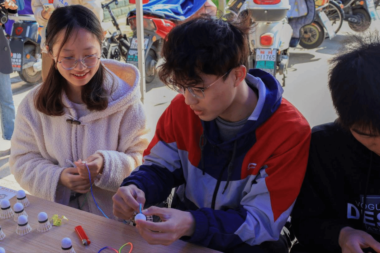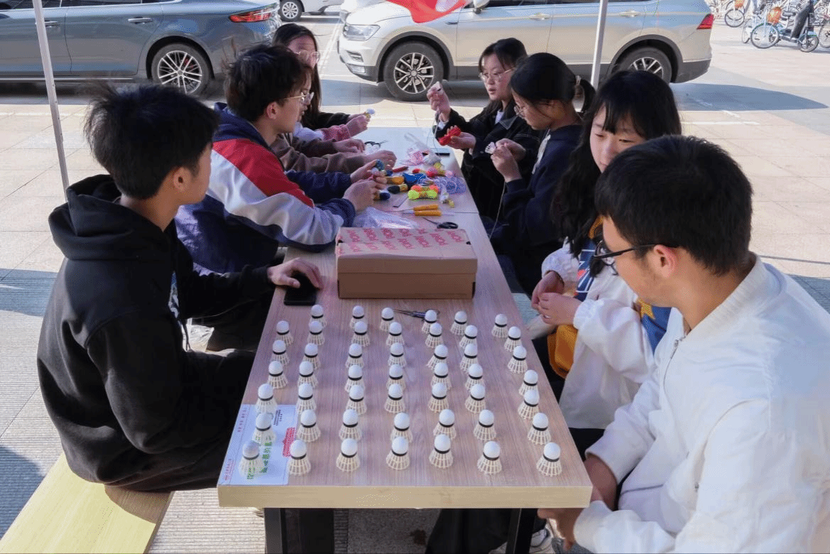西苑食堂广场上人头攒动,原来是大学生“加速度”羽毛球协会正在举办“变废为宝”羽毛球挂件编织活动,近100名学生参与其中,为废弃羽毛球“披上”了“新衣”。