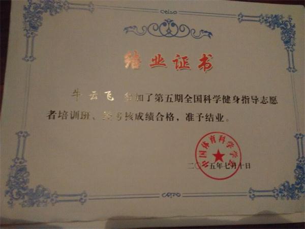 此次培训课程牛云飞博士结业成绩优异,成功获得由中国体育科学学会颁发的结业证书。