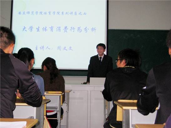 2010年10月20日晚,香蕉视频 闻又文老师在体育馆多媒体教室作了“大学生体育消费行为分析”的学术报告,讲座主要针对体育消费行为的概念、类型展开,重点阐述了大学生体育消费行为的阶段、大学生体育消费行为的特点和影响大学生体育消费者行为的因素,并结合安庆师范学院的情况进行具体分析。听众主要来自香蕉视频 师生,讲座气氛热烈,不断博取阵阵掌声。