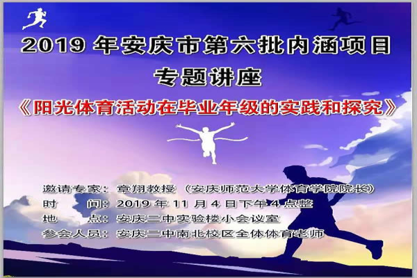 院长章翔教授为安庆二中南北区体育教师开展了内涵项目《阳光体育活动在毕业年级的实践和探究》专题讲座。邱国民副校长也前来聆听讲座,本次讲座由体育教研组长张忠庆主持。