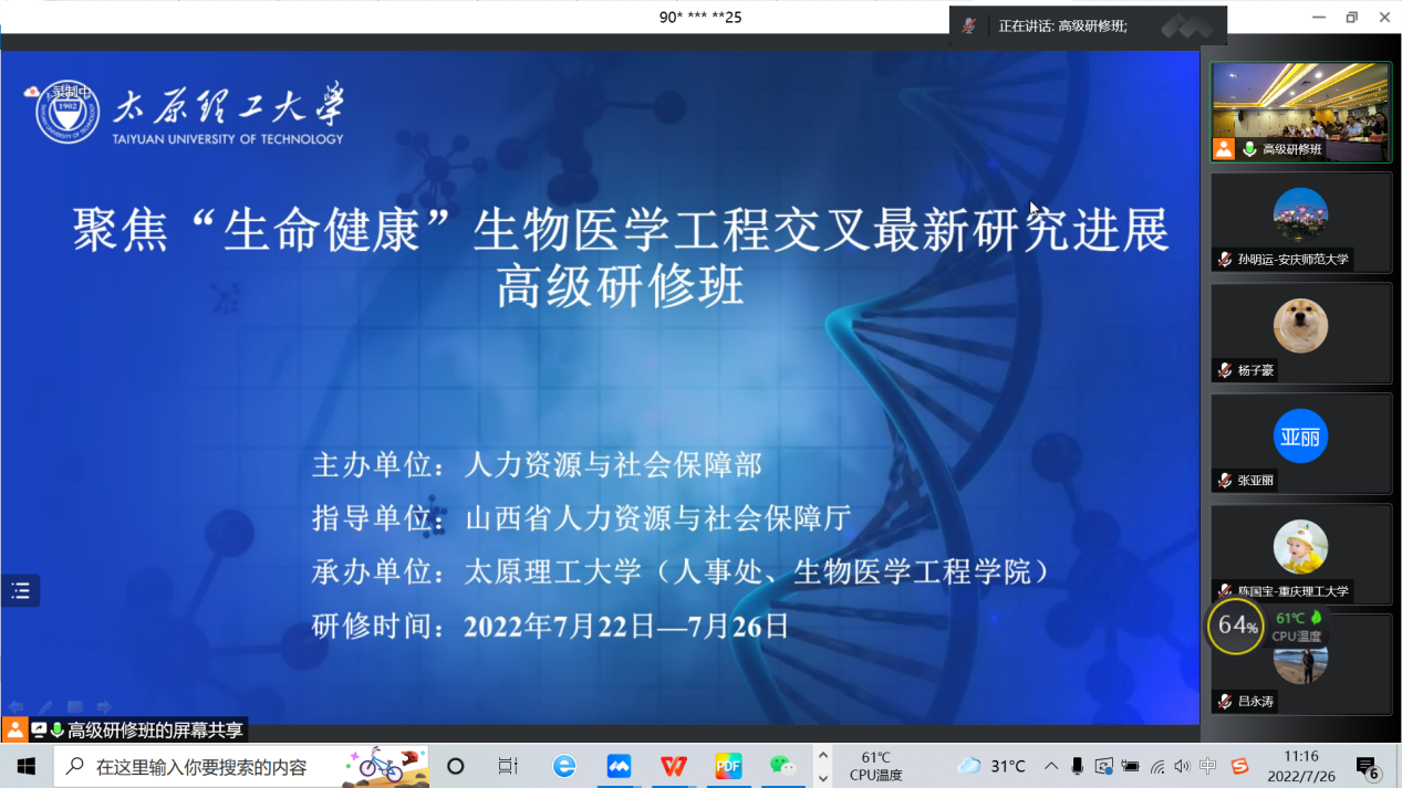 7月22-26日,由国家人力资源和社会保障部主办、山西省人力资源和社会保障厅指导、太原理工大学承办的聚焦“生命健康”生物医学工程交叉最新研究进展高级研修班在太原开班。来自全国各地高校73名学者参加此次研修会议。孙明运教授代表香蕉视频