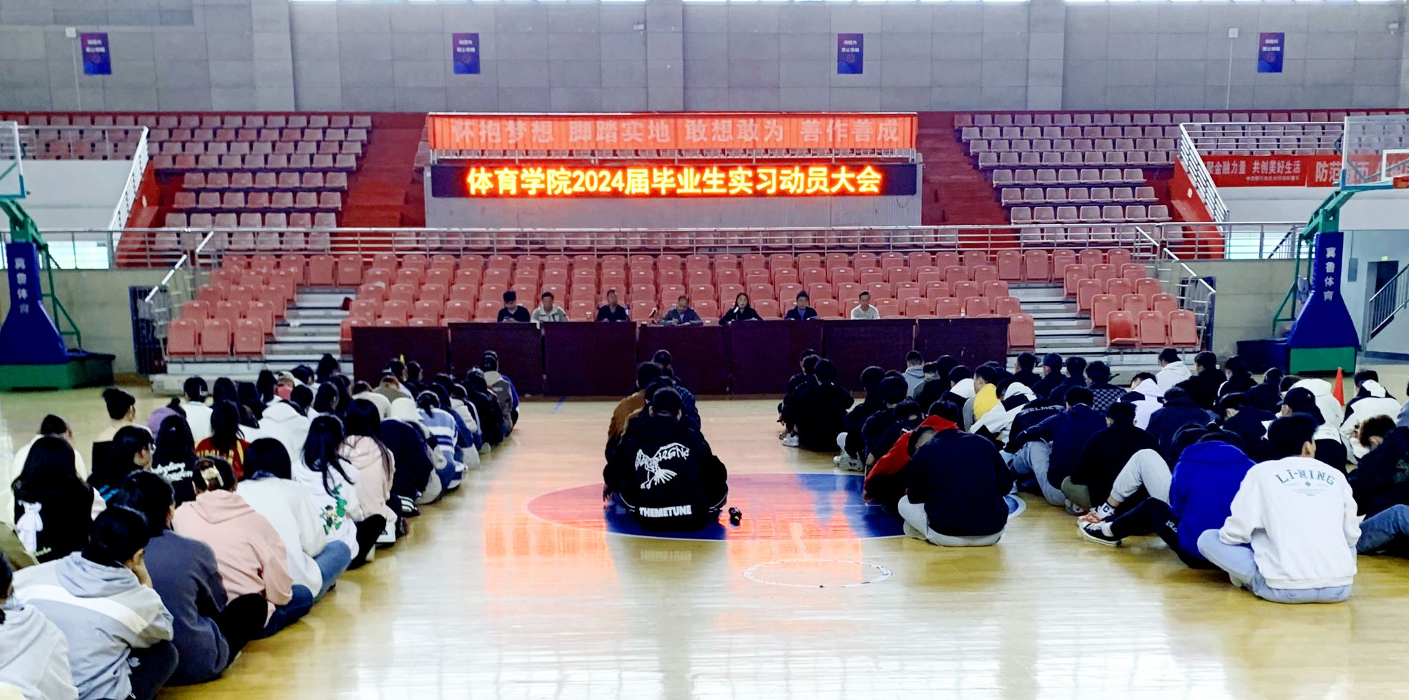 在龙山校区篮球馆召开2024届毕业生实习动员大会。学院党委副书记王玮、副院长林秋菊出席会议,实习指导教师代表、毕业班辅导员、教学办负责人和全体实习学生参加了会议。会议由林秋菊主持。