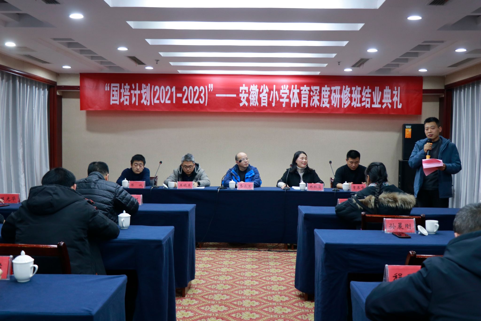 林秋菊代表项目组作项目总结。她从项目实施概况、项目成果概况、项目实施主要举措、项目实施经验特色四个方面进行总结,充分肯定了项目实施的成效。王晓东强调,本次国培是提高小学体育教师教学能力和素质的重要途径,希望参加培训的老师们能够学以致用,将所学知识运用到实际教学中,为推动基层体育教育事业的发展做出贡献。