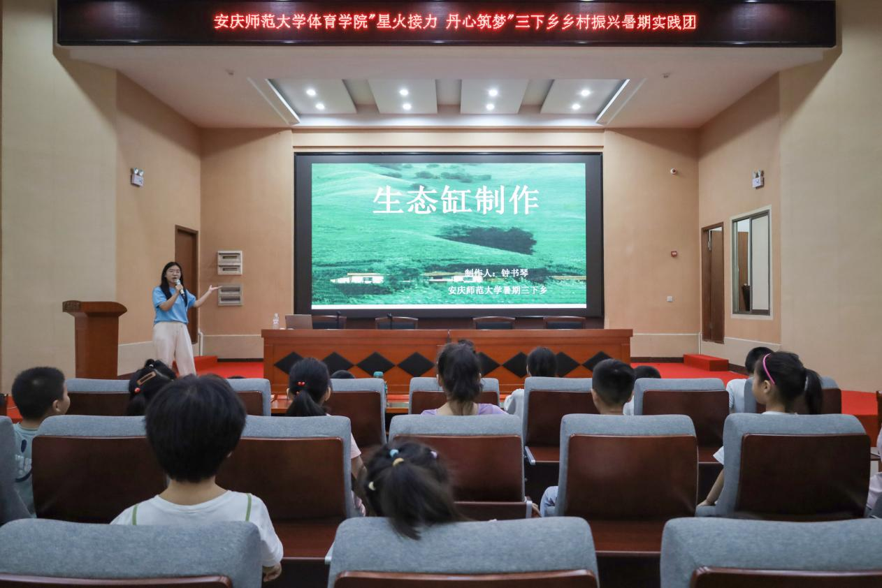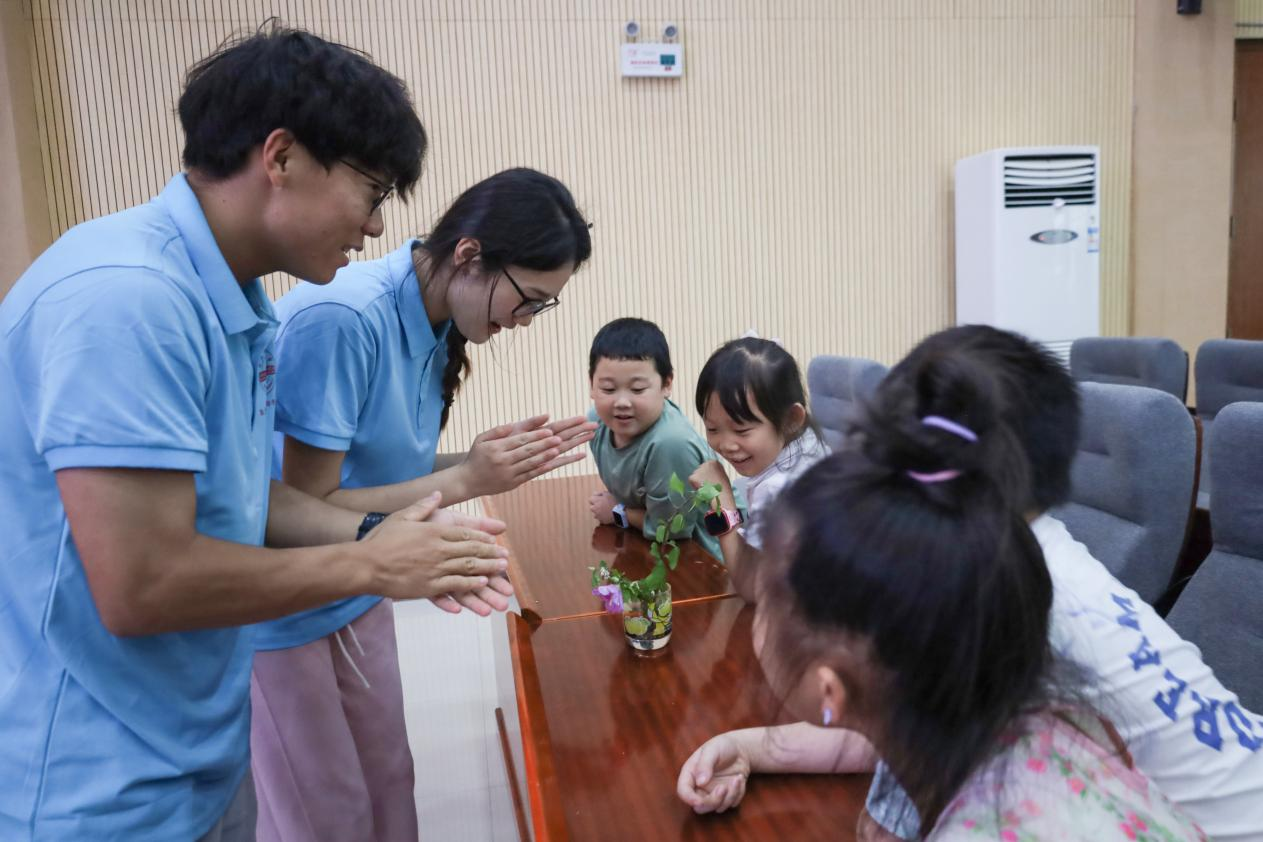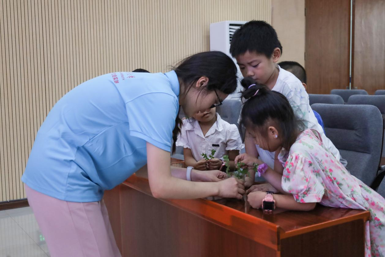 “星火接力,丹心筑梦”乡村振兴暑期社会实践团的大学生带领暑期托管班儿童体验制作生态缸,让孩子们在实践中学习生物知识。