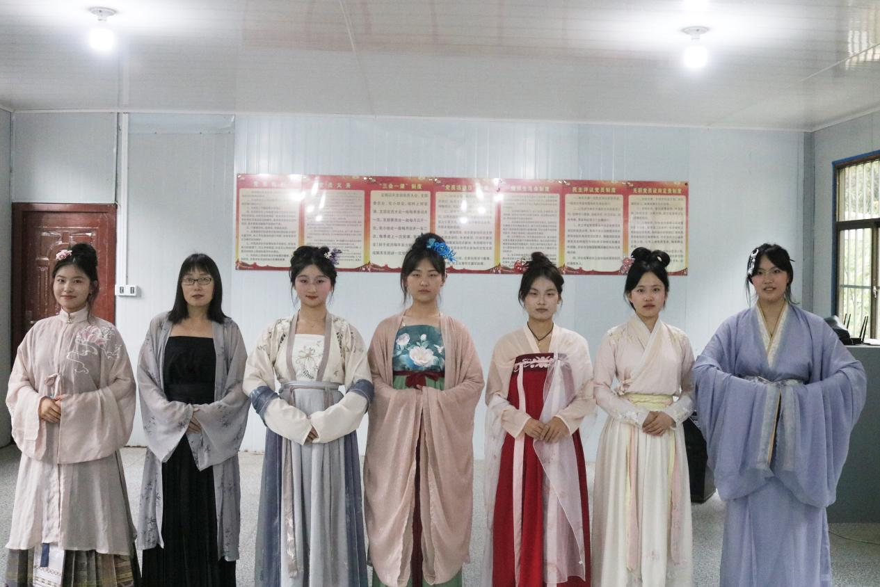 除了缠花和漆扇,汉服展示也是本次活动的一大亮点。近年来,汉服文化兴起,越来越多的人开始关注并喜爱汉服这一传统服饰。为更好展示中华古典服饰文化,实践团的女队员们身着不同朝代的服装,款款而行,通过生动优美的动作,展现各自所穿汉服的特点,为村民们带来了一场视觉盛宴。