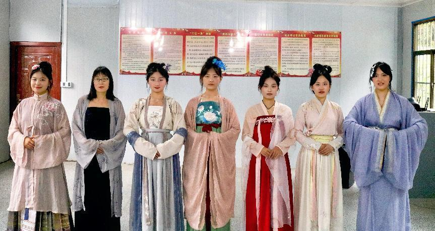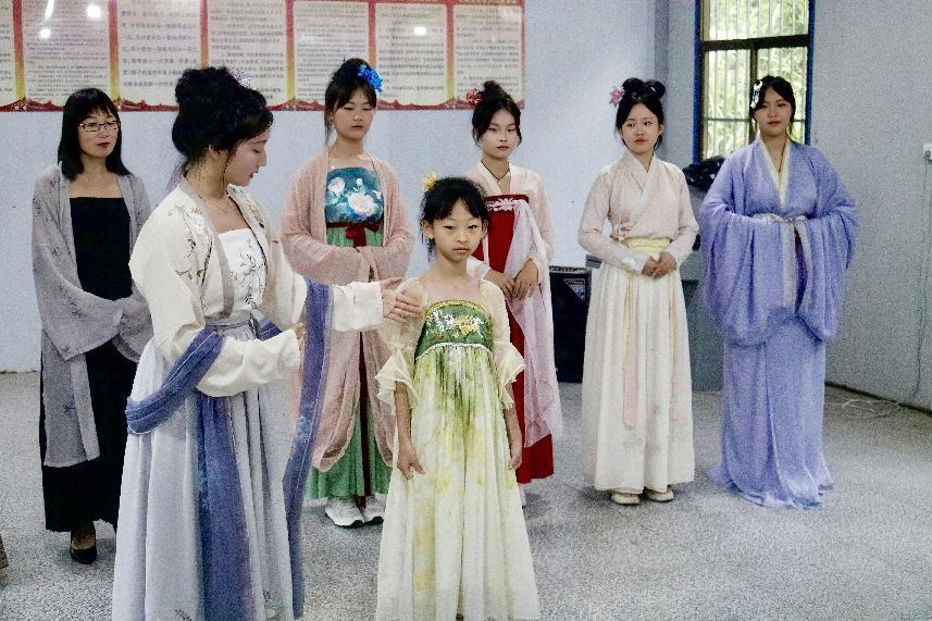 实践团成员利用午休时间绘制妆面,高盘发髻,穿戴汉服。战国的深衣,汉朝的曲裾,以及明朝的圆领袍,每一种服饰都是对历史的忠实再现。运动康复专业2023级的周点玲身穿大红绣花齐胸儒裙,内搭妃色罗纱对襟衫衣,外披金银云纹牡丹帔帛。“我是首次体验唐制汉服,希望用心地装扮可以为孩子带来完美地呈现。”她表示,期望近距离展示能够让孩子直观地感受到汉服的质感和色彩,提升孩子对汉服及传统文化的认知和兴趣。