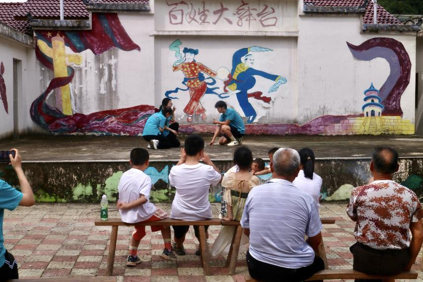 “舞动青春·志愿家乡”乡村振兴暑期社会实践团于太湖县西冲村百姓大舞台上宣传禁毒知识,演绎致敬缉毒英雄的动人故事。