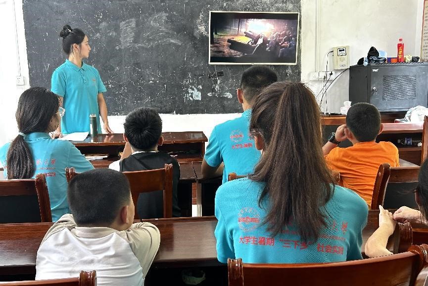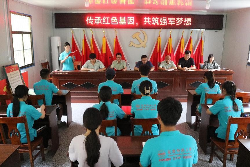 “舞动青春·志愿家乡”乡村振兴暑期社会实践团赴太湖县西冲村开展“三下乡”社会实践活动,与村中干部重温建军峥嵘岁月,为当地孩子开展一堂别开生面的红色思想教育课。
