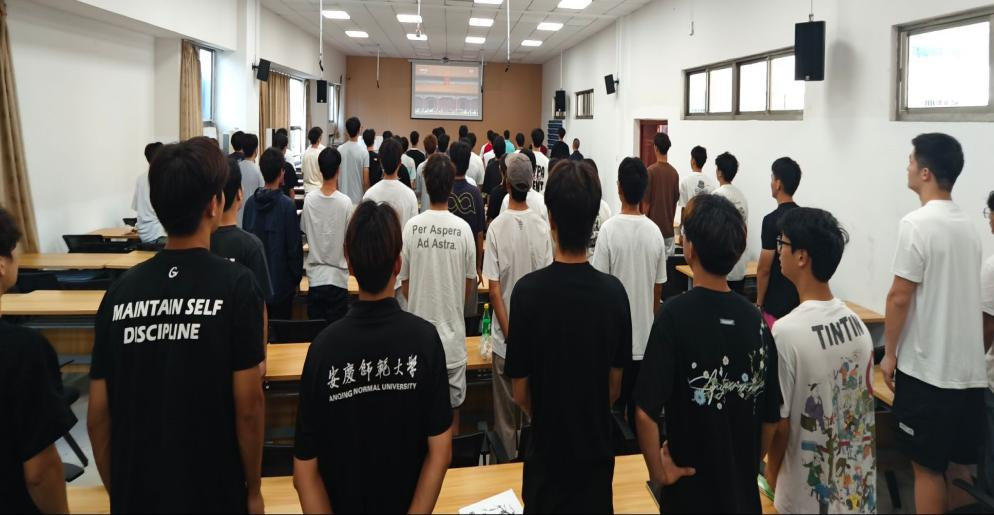 随着国旗护卫队官兵从人民英雄纪念碑稳步行进至天安门广场北侧升旗区,台前屏幕里,中国人民解放军联合军乐团奏响雄壮的《义勇军进行曲》,台下,全体师生起立,齐声高唱国歌。阅兵仪式正式开始,学生的目光跟随党旗、国旗、军旗,向东长安街看去。分列式环节,受阅部队按空中护旗梯队、徒步方队、战旗方队、装备方队、空中梯队的顺序,依次通过天安门广场,场面壮观震撼。
