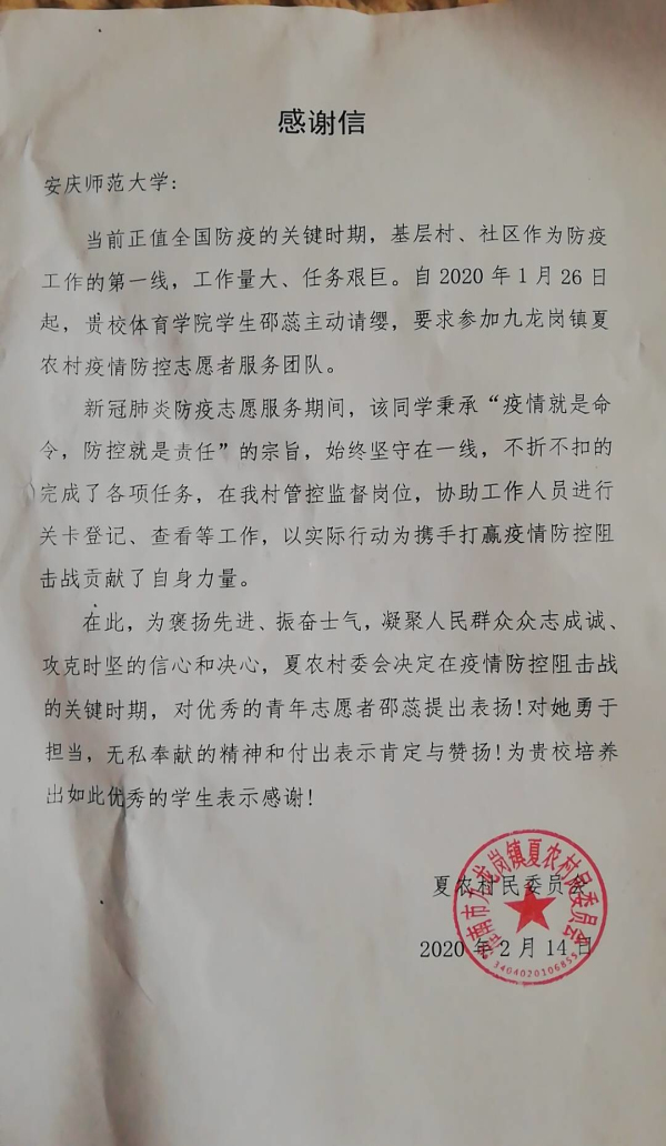 此外,体育教育专业2016级(1)班的丁炎槐、休闲体育专业2016级蒲昊然、体育教育专业2017级(3)班章思琦、运动康复专业2017级石颍、体育表演专业2018级(2)班李宁宁、体育表演专业2018级(3)班邵蕊和李硕硕、运动康复专业2018级曹文慧、体育教育2019级(4)班的任凯丽、体育表演2019级(3)杨琪敏等四十余名同学都积极参与了当地防疫支援服务中。除积极参与志愿服务外,体院学生党员踊跃向湖北疫区捐款,表达对湖北人民的支持与良好祝福。