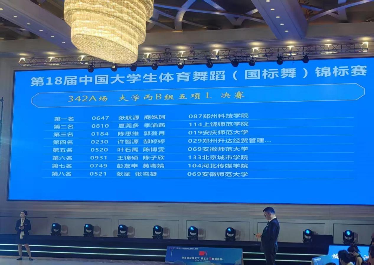 体育表演专业6名同学参加比赛,共获得3项二等奖(1个第三,2个第四)的优异成绩,其中在艺考表演招生专业最高组别(丙B组)的五项拉丁比赛中取得第三名的骄人战绩,同时也是安徽省高校在本组别上的最好成绩。