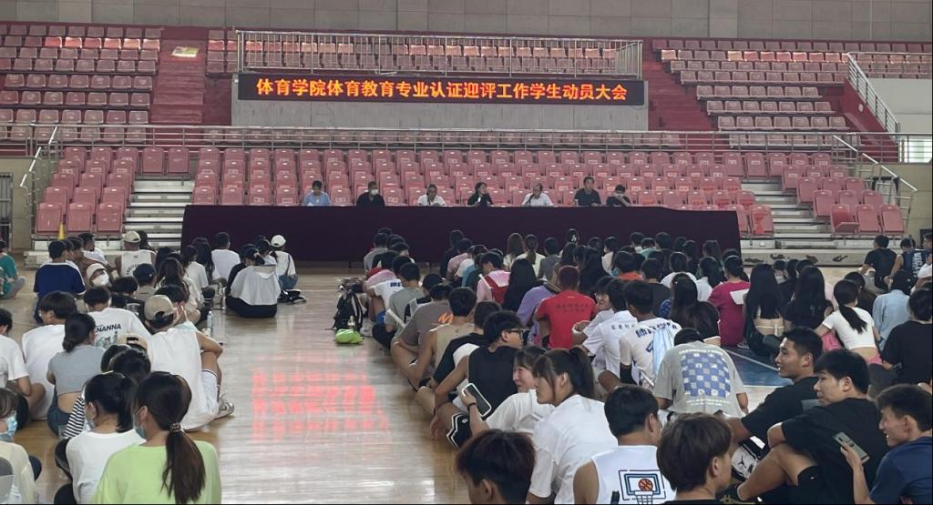 篮球馆召开专业认证迎评工作学生动员大会。体育学院副院长林秋菊、党委副书记王玮、学院教师代表王晓东博士和部分专职辅导员代表出席会议,学院全体在校学生参加本次会议。会议由学院党委副书记王玮主持。